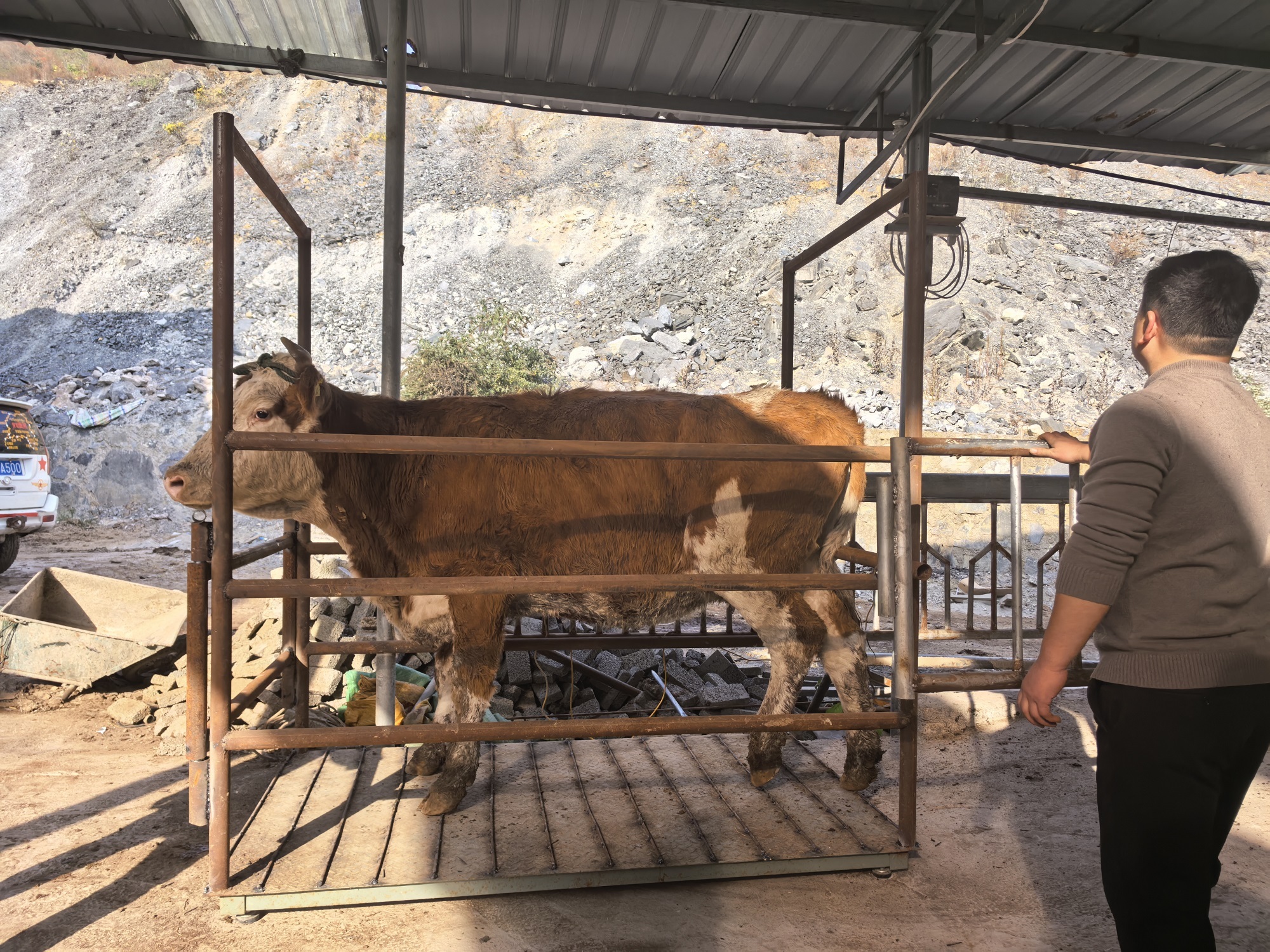 “为让这批肉牛尽快适应本地环境,我们准备了调理栏,将进行为期一周的适应性饲养,待其完全适应后再转入新建的标准化牛舍。”“超市”负责人吴配月一边带领工作人员为肉牛称重、建档,一边向大家介绍道。据了解,“小牛超市”此前引进的200余头肉牛已全部销售一空,此次集中引进的均为优质成年西门塔尔肉牛,每一头体重都在800到1000斤之间,品质较以往更优。