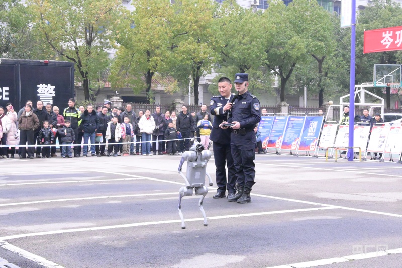 仪式结束后,精彩纷呈的警营展示与互动环节依次展开。在技能展示环节中,交警队员们以整齐划一的手势操,展现出严谨专业的执勤风貌;警用机器狗灵活演示、热情互动,尽显智慧警务的创新成果。