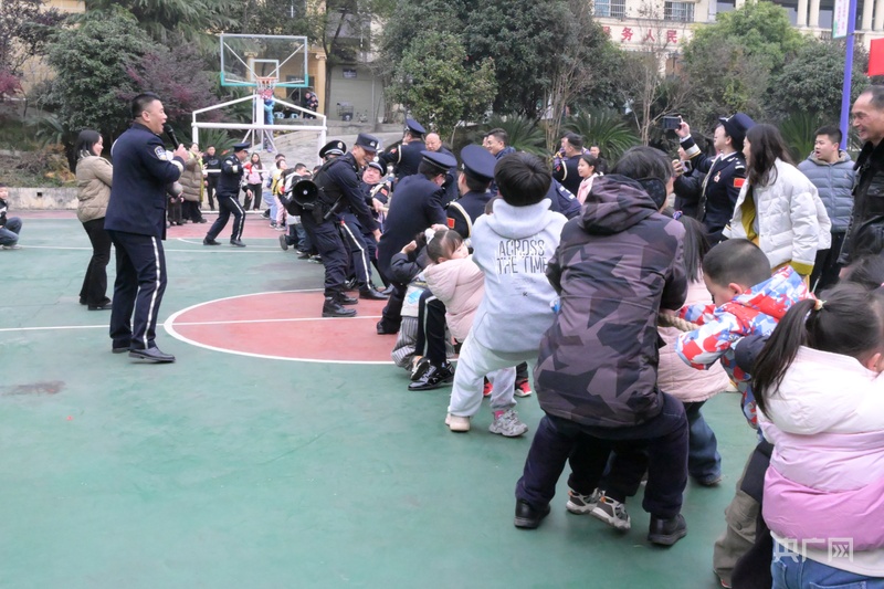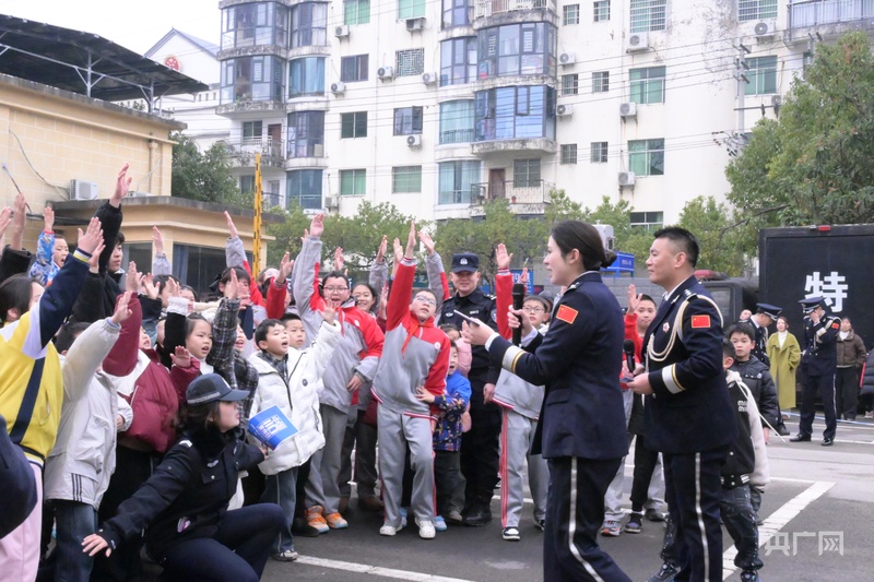 民警为围观小朋友讲解装备功能(央广网发 周丽 摄)