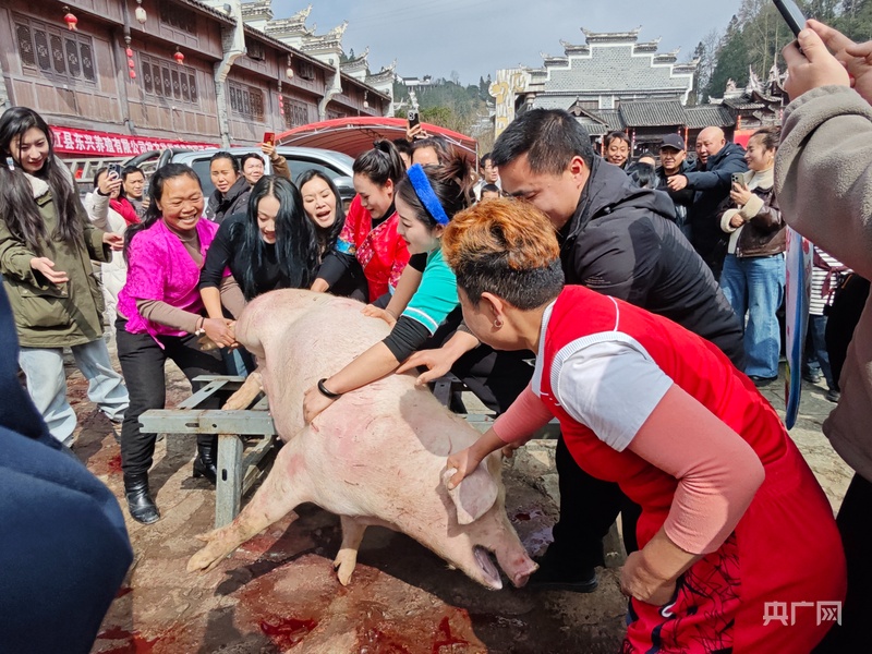 村民们抓年猪,为刨猪宴张罗准备(央广网发 黄菲 摄)