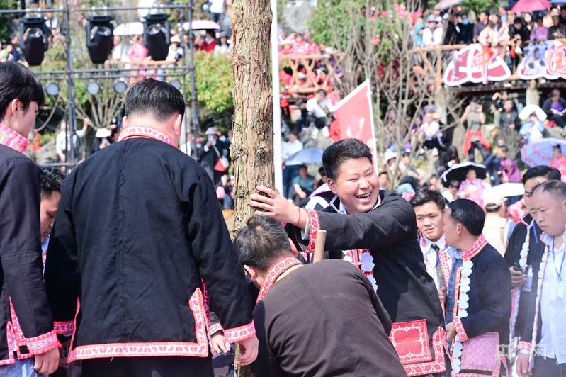 正午十二点半,跳花广场又迎来了迎花树、拦门酒等特色活动。迎花树的队伍浩浩荡荡地从陇戛老寨走到跳花广场,由两名芦笙手载歌载舞开路,一名歌师唱起酒歌,一人手捧一段红布,众人将砍下来的花树请到广场,绕场三圈,然后将花树栽到广场中央。同时,广场门口站着一排排拿着酒杯拦门敬酒的苗族姑娘,拿着盛满了清香四溢的糯米酒等各种粮食酒的牛角,唱起敬酒歌,邀请客人喝酒。这些特色活动既展现了苗族深厚的文化底蕴,也让游客感受到苗家人的热情好客。