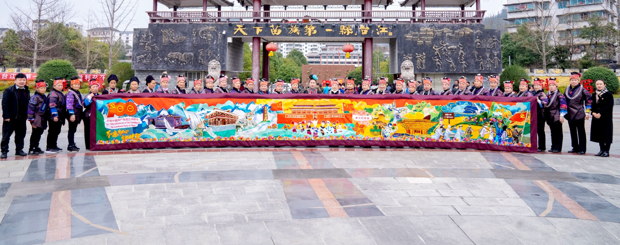 绣娘们与绣制的《锦绣台江》长卷合影(龙军 摄)
