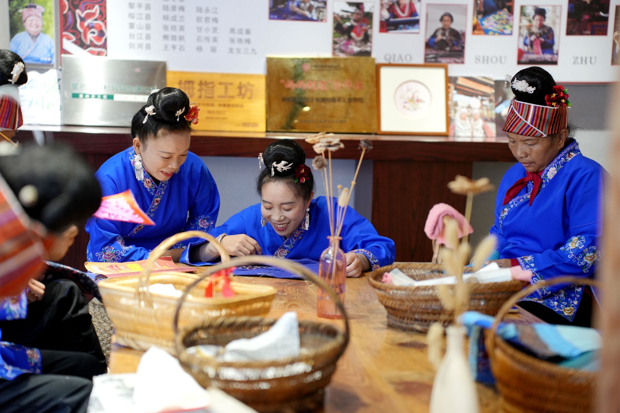 在台江县老屯乡长滩村“妈妈制造”苗绣合作社内,十几名绣娘围坐在一起,五彩丝线在指尖翻飞,苗族图案在布帛上逐渐成型,针脚的细腻与图案的精美,呈现了合作社内忙碌而有序的劳作场景。