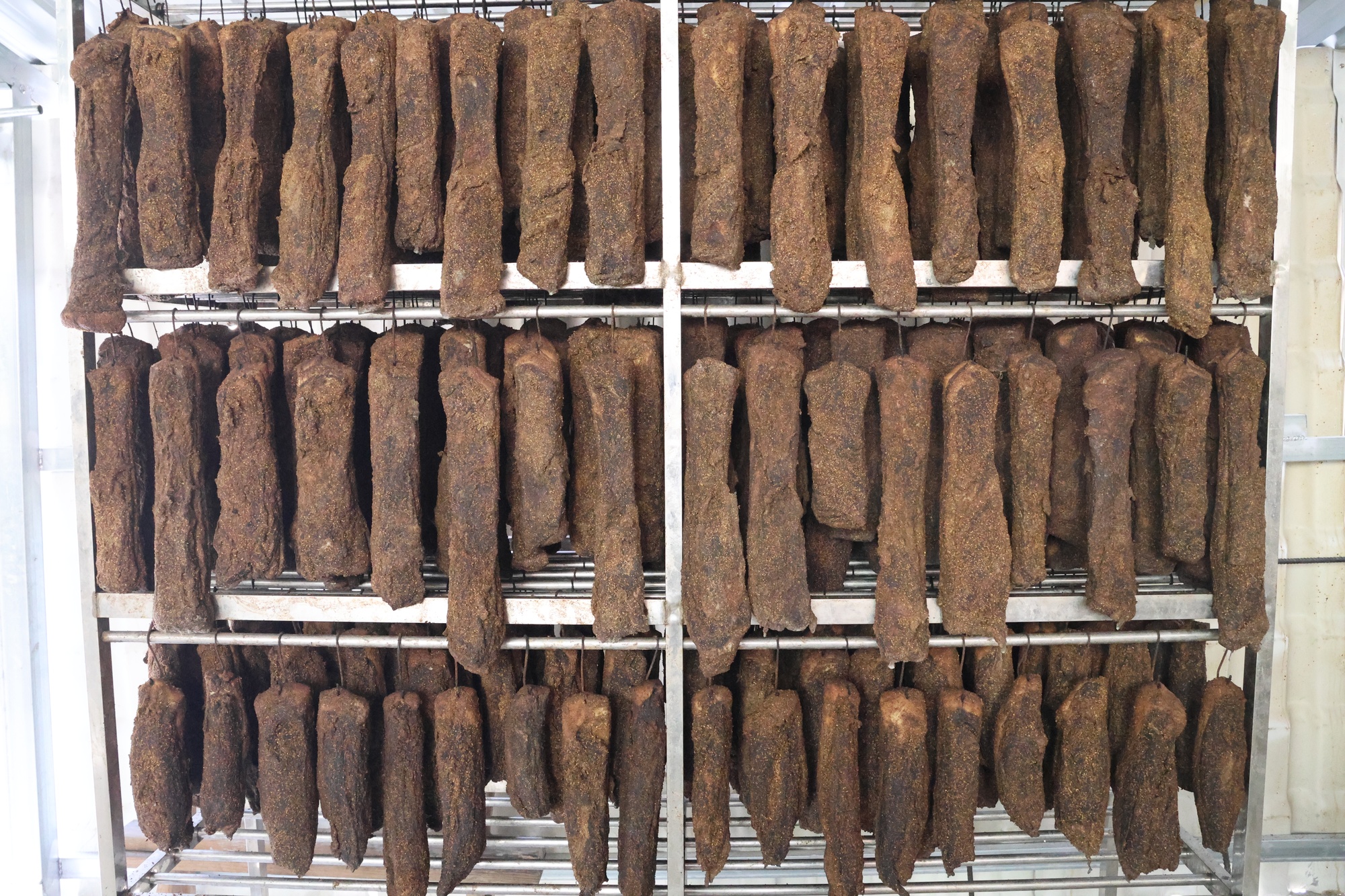 甘勇穿梭其间,不时抬手翻看腊肉的成色,指尖轻触肉皮感知火候,眉眼间满是专注。“青冈炭熏出来的腊肉色泽鲜亮,甘蔗的糖分能提鲜增香,必须小火慢熏,味道才能透进肉里。”他笑着介绍道,做腊肉香肠,选材是重中之重。自家店里选用的都是独山本地土猪,肉质紧实、油脂分布均匀,熏出来的腊味格外香浓,而店里沿用的配方,更是祖辈传下来的老手艺,做出来的腊肉每一口都是独属于独山的乡愁味道。
