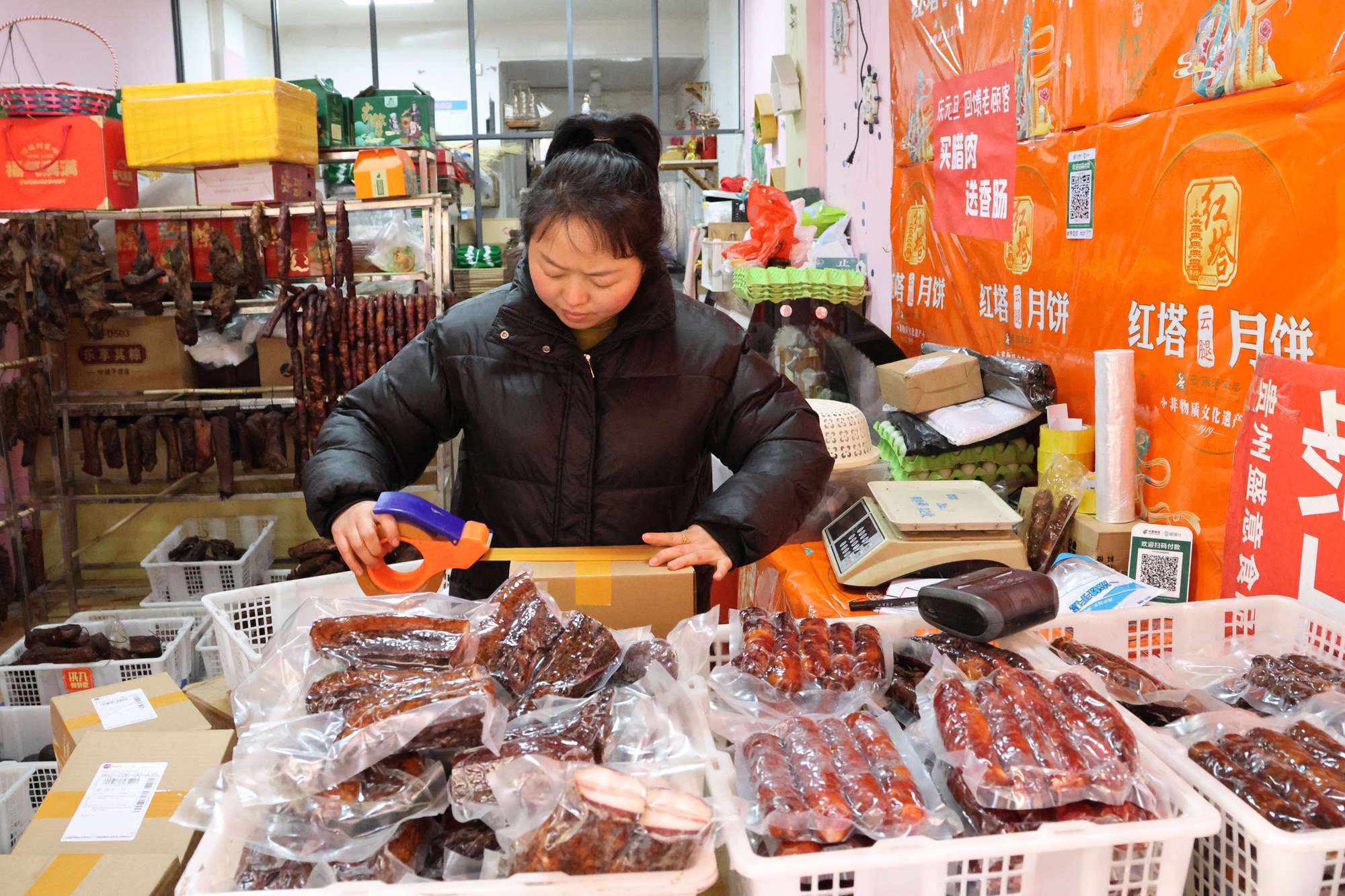 走出甘勇家的小店,循着愈发浓郁的香气前行,街边的小红粽子腊肉铺也是热闹非凡。店铺不大,却挤满了前来选购的顾客,有左邻右舍在熟门熟路地挑拣,也有特意赶来的食客,人们精心选好腊味,只为邮寄给远方的亲友。一旁,打包的纸箱堆了半间屋子,快递单贴得密密麻麻,一派销售旺盛、打包繁忙的红火景象。