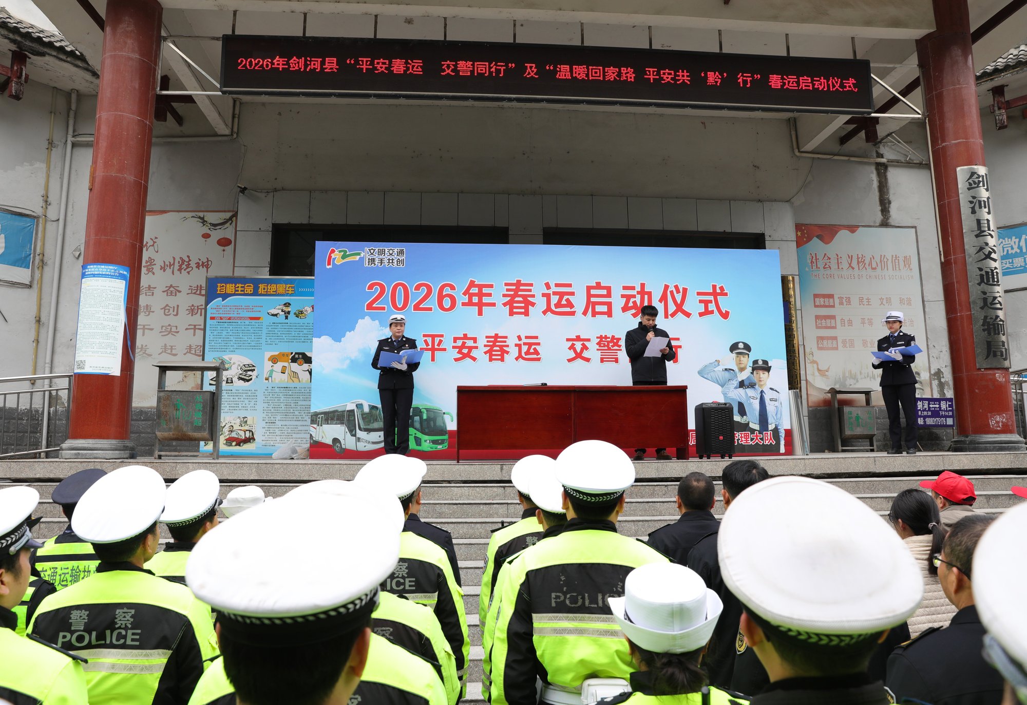2月2日,2026年贵州省黔东南州剑河县“平安春运 交警同行”暨“温暖回家路 平安共‘黔’行”主题春运仪式正式启动,标志着为期40天的春运暖心护航行动全面展开。全县上下凝聚合力,全力守护群众平安返乡、顺利返程。