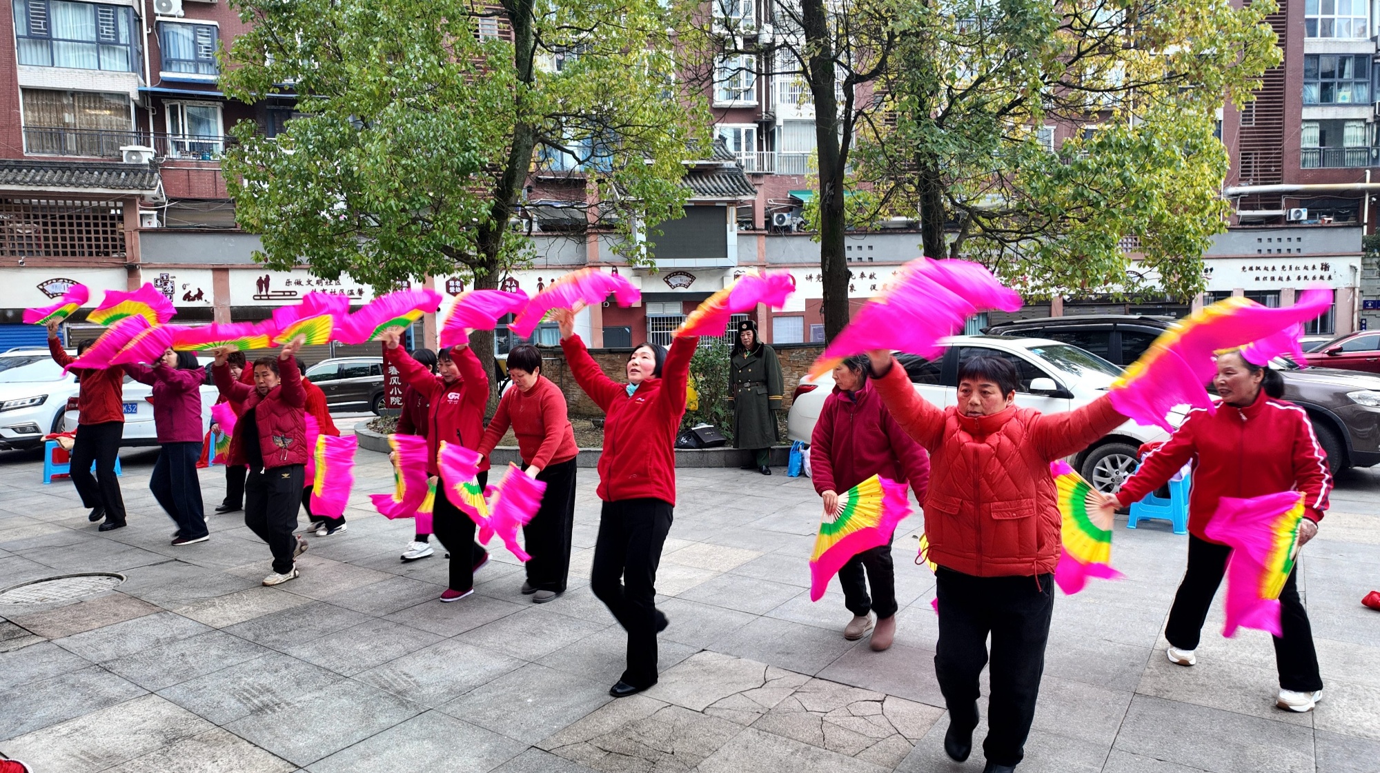 排练现场亮点纷呈:20余名青年组成的舞龙队在队长指挥下,步伐统一、动作连贯,将“推、送、举、抖”等动作演绎得流畅有力;丹霞社区排练室里,快板节目《遵行新风尚》节奏明快、词句铿锵,以朗朗上口的唱词,生动传递移风易俗、勤俭节约、孝老爱亲等文明理念;虹顶社区平均年龄超六十岁的老年文艺队身着彩衣、手执绸扇,反复打磨每一个转身、每一次挥扇,展现出“岁月如歌,风采依旧”的昂扬姿态。带队排练的赵温珍阿姨一边示范一边鼓劲:“咱们上台就要拿出最好的状态,展现我们老年人的风采!”