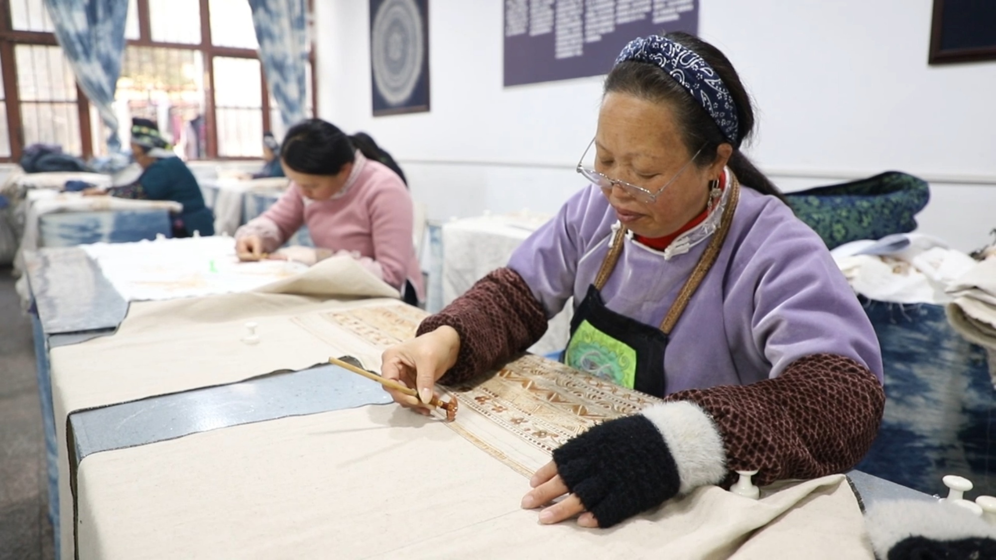 走进丹寨县一家蜡染工坊,到处是一片繁忙景象。为满足市场需求,画娘们提前返岗复工,加班加点赶制发往四川、杭州、上海、北京等地的3000件订单。与此同时,前来工坊体验蜡染的游客也络绎不绝,他们在画娘指导下手持蜡刀,在白布上认真描绘,沉浸式感受苗族蜡染技艺的独特魅力。