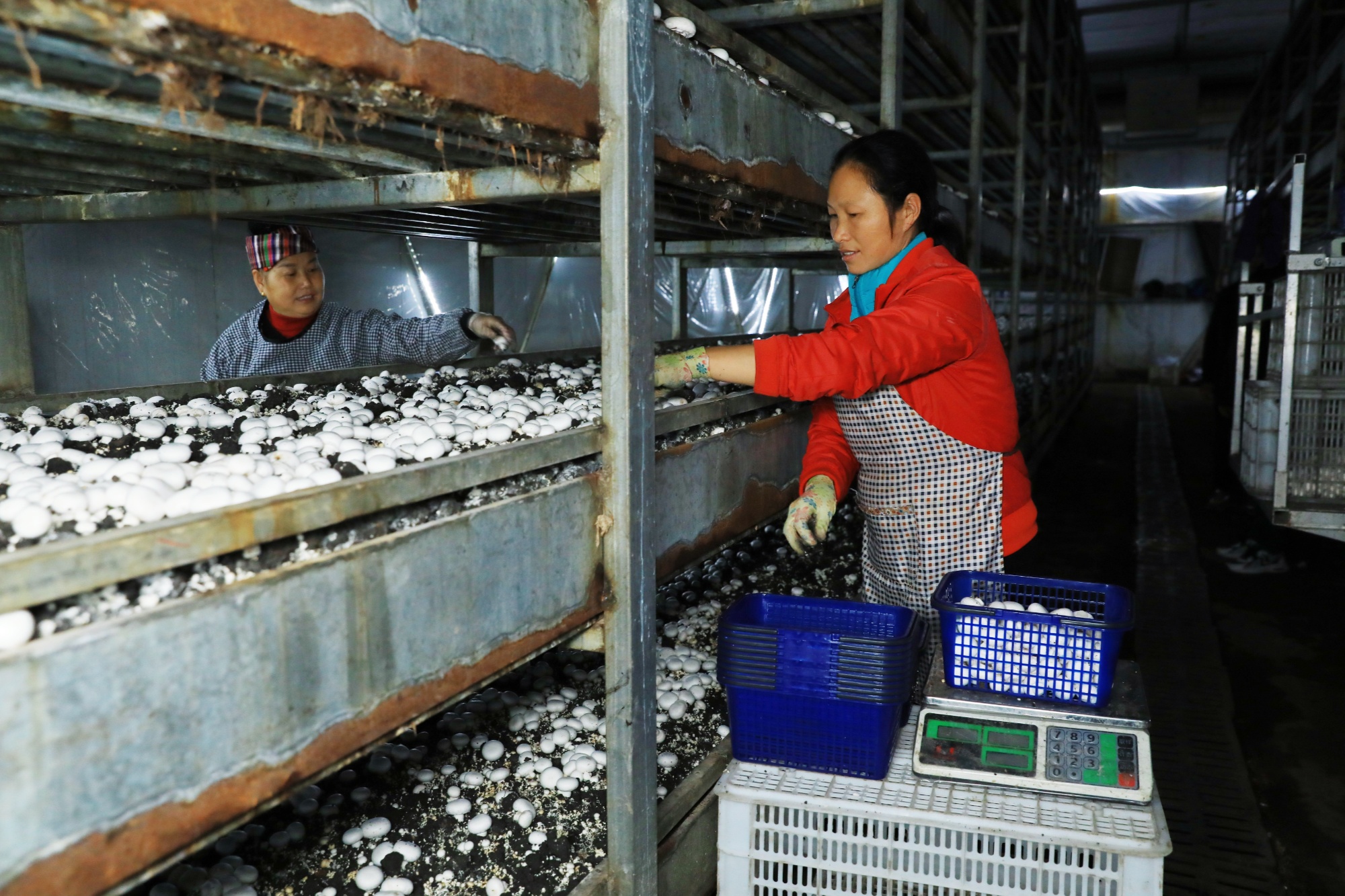 恒温菇房里工人正在采菇(杨洁茹 摄)
