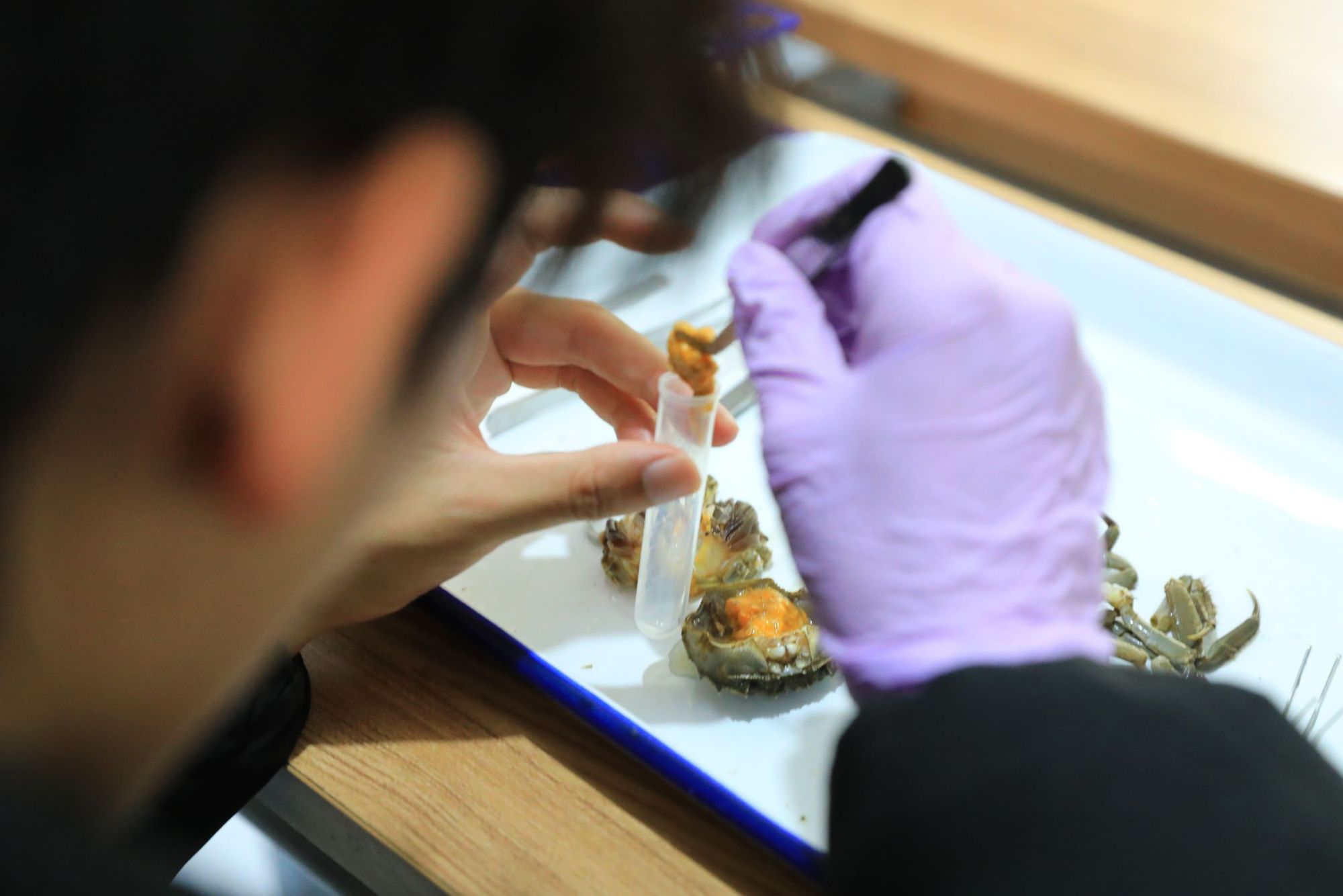 上海海洋大学的研究生正在解剖河蟹(剑河县融媒体中心供图)