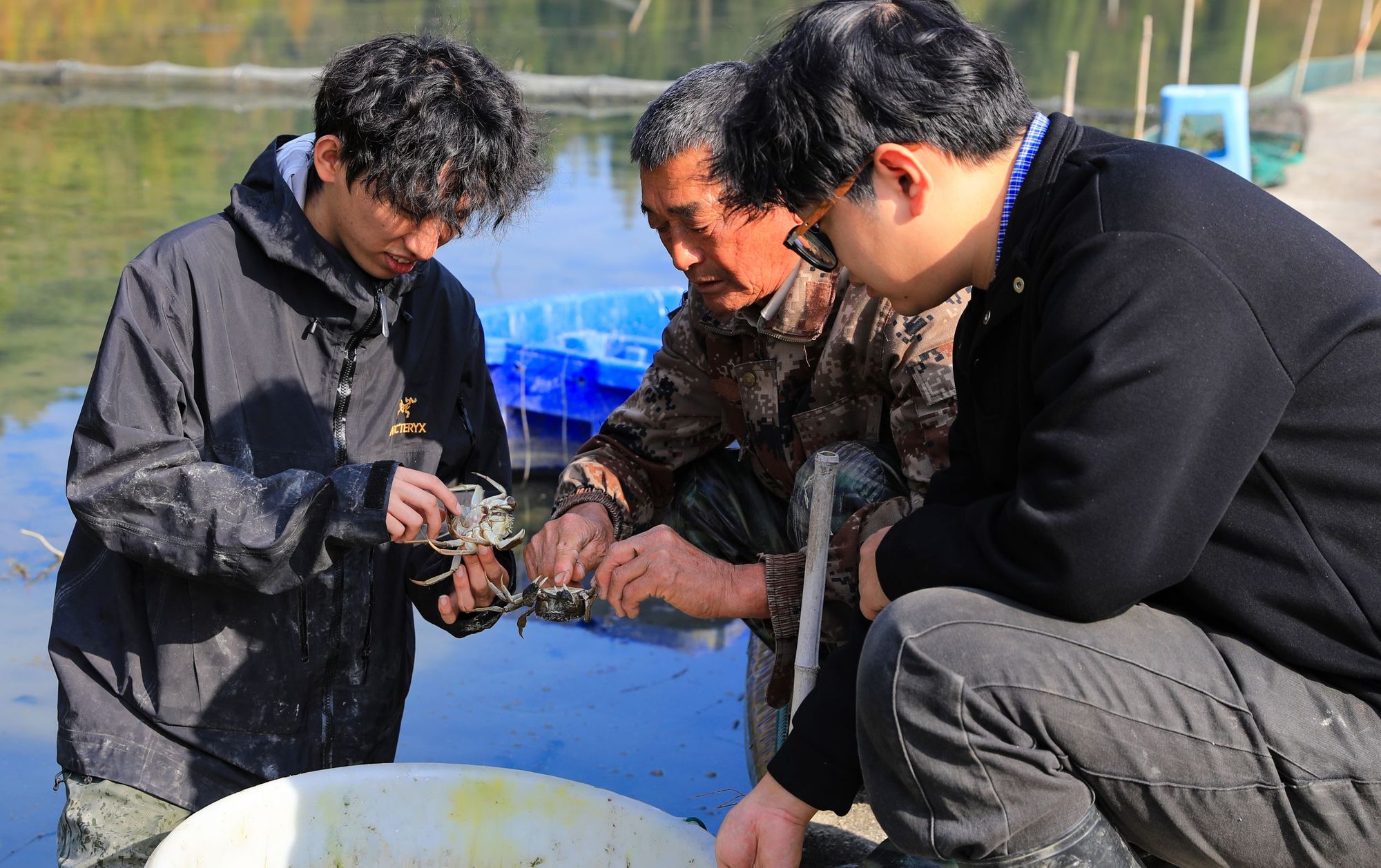 在科技改良的助力下,这里的虾蟹品质优良,成了市场上的“香饽饽”。“你看这螃蟹,青壳、白底、红嘴,蟹黄从后面红到嘴部,只有质量特别好的螃蟹才能长成这样。”上海海洋大学技术员董业田拿起一只大闸蟹,指着饱满的蟹黄介绍,语气中满是自豪。