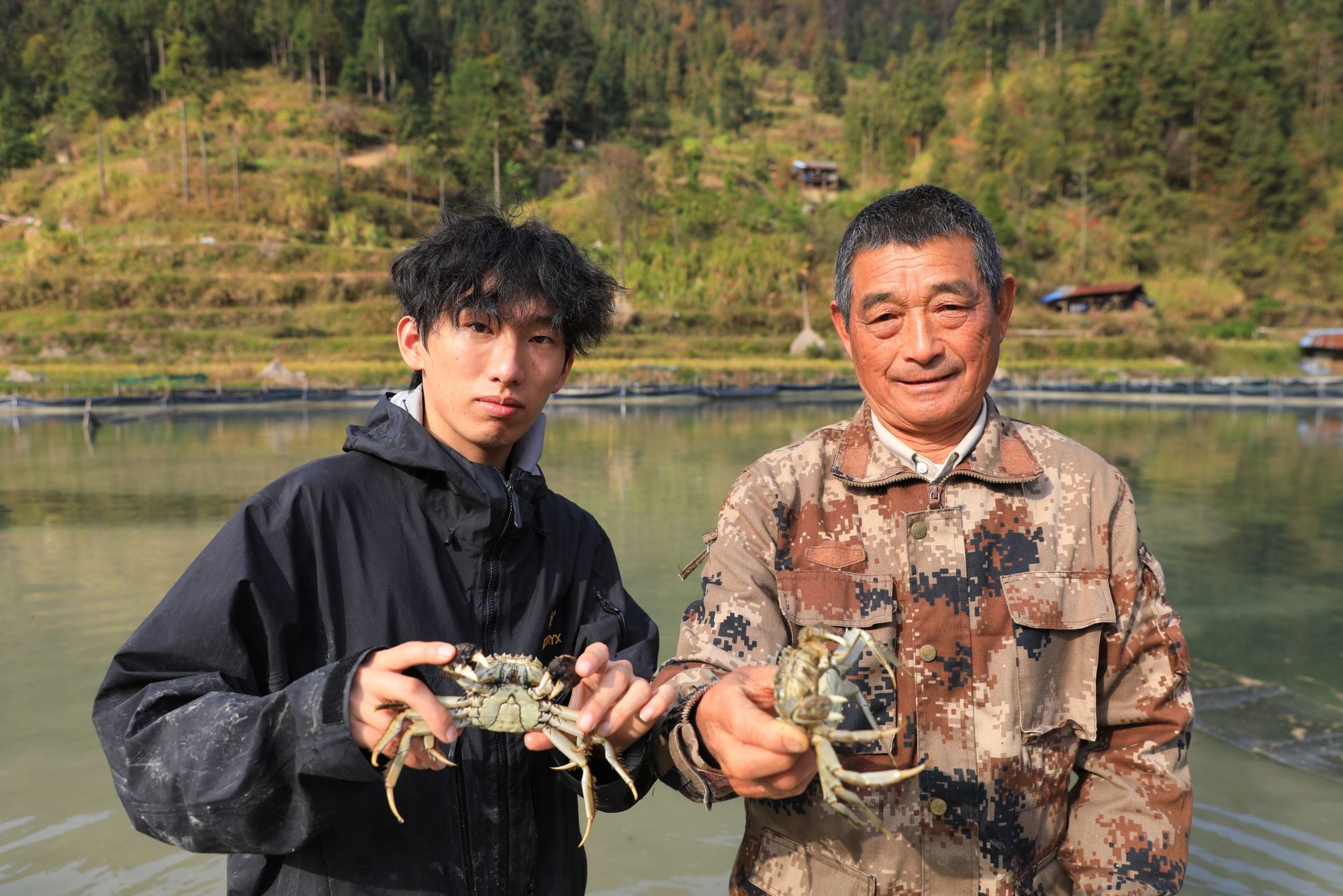 上海海洋大学的技术员和研究生展示养殖的河蟹(剑河县融媒体中心供图)