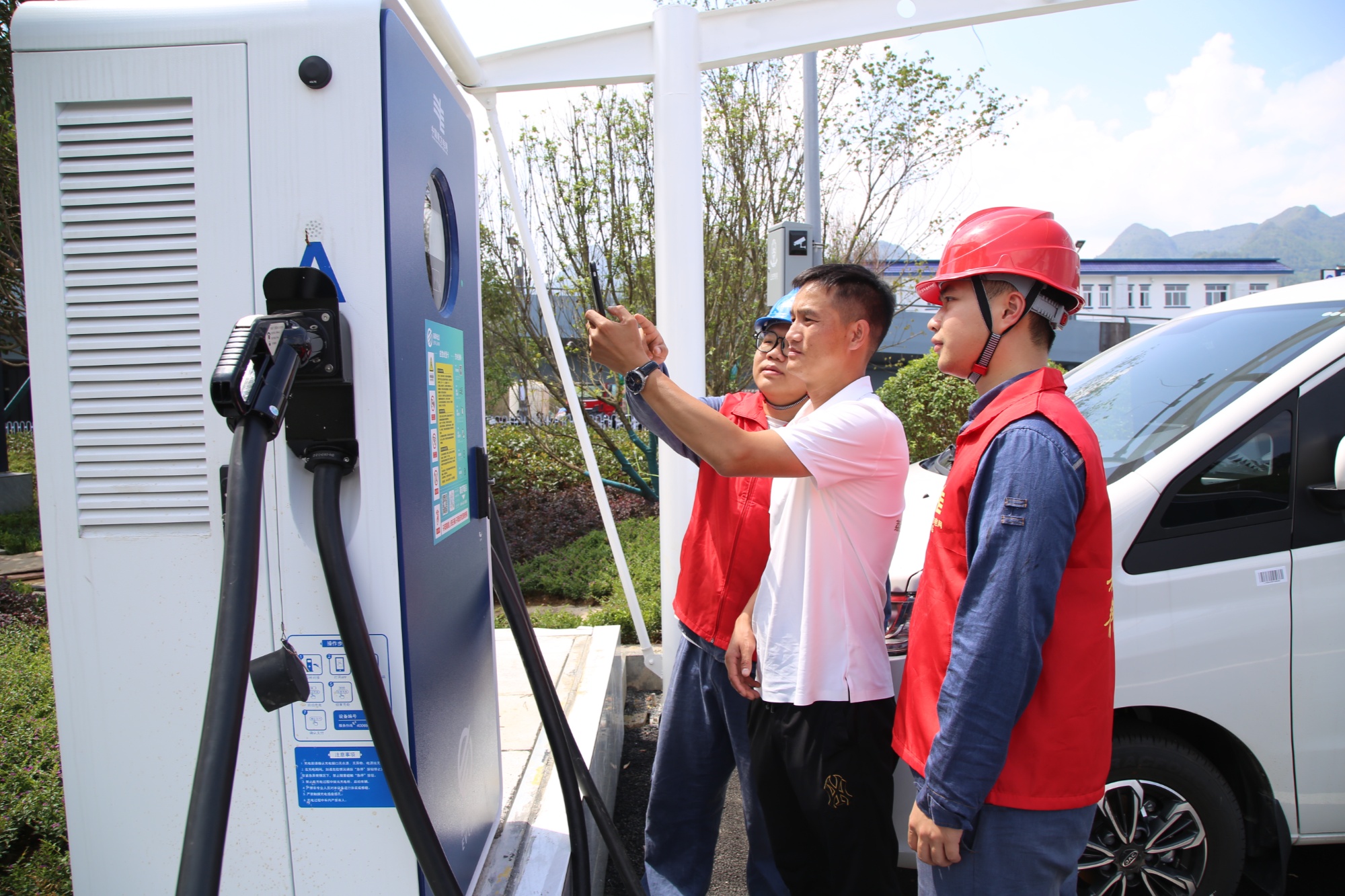 都匀荔波供电局青年服务队在荔波县小七孔景区东门停车场指导附近居民使用充电桩(王文涛 摄)