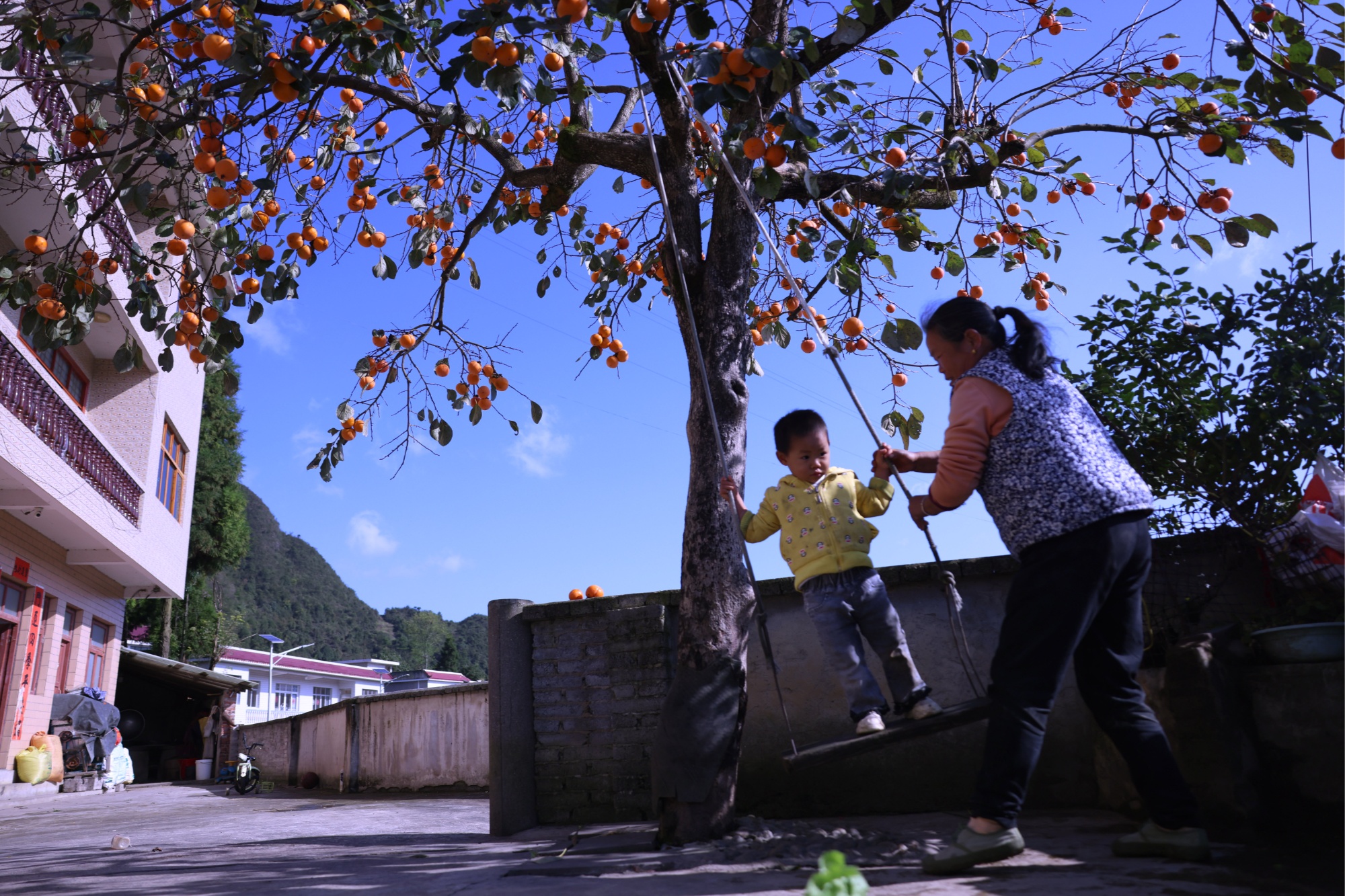 大人带着孩子在乡间柿子树下玩耍(麻江县融媒体中心供图)