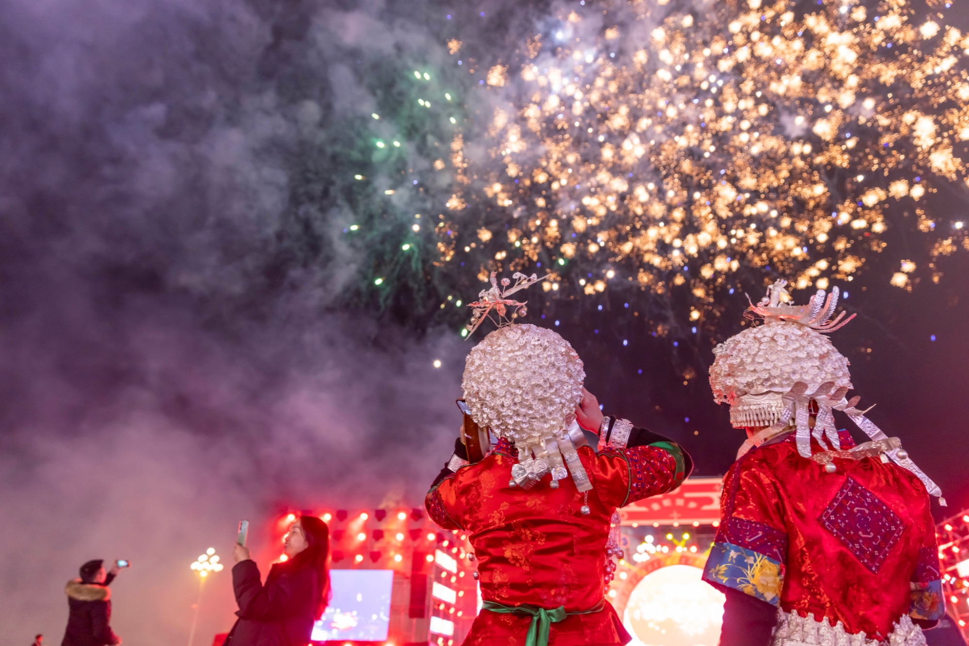 身着盛装的苗族群众在开幕式上观看烟花秀(施秉县融媒体中心供图)
