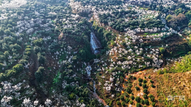 漫山遍野的樱桃花与山间小溪勾勒出优美的春日画卷(央广网发 赵桦 摄)