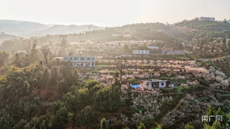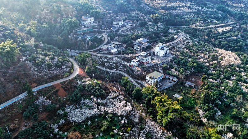 央广网六盘水2月24日消息(记者杨贇 实习记者何玲) 春风送暖,万物复苏。连日来,贵州省六盘水市水城区发耳镇万亩玛瑙红樱桃树迎来盛花期,漫山遍野的樱桃花竞相绽放、如云似雪、簇拥枝头,将连绵山野装点成一片浪漫花海,成为早春时节乌蒙大地一道靓丽的风景线。