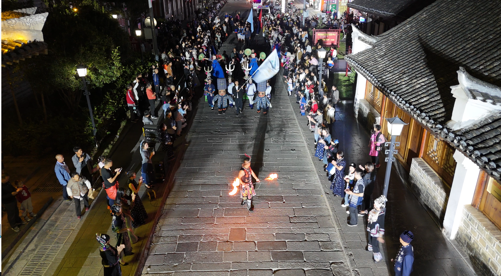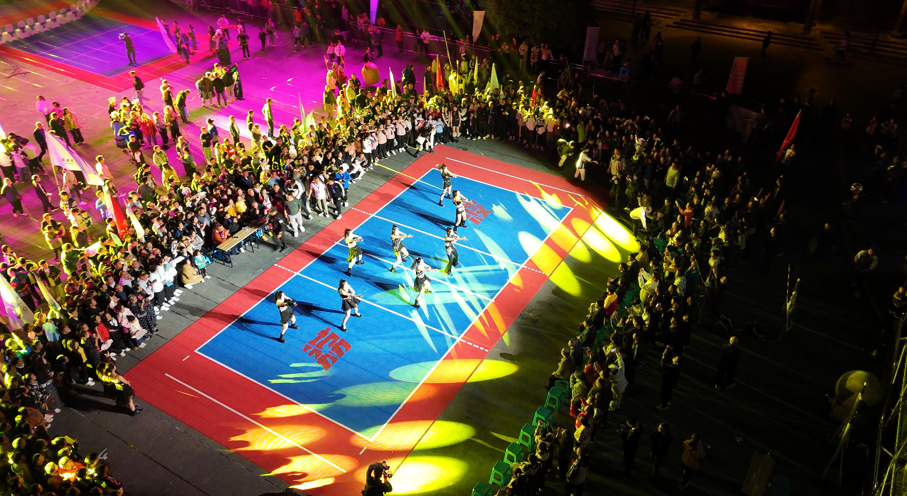 运动员、裁判员代表队依次入场。跟随现场灯光的闪烁,广场街头涌动着人潮。身着民族盛装的姑娘们夹道欢迎,各大乡镇代表队方阵从街头入场,还带来了各具特色的民族节目快闪表演。魅力小七孔的《舞狮》、瑶山瑶族乡的陀螺表演、瓜果朝阳的瓜果展示、玉屏街道的《刷把舞》……轮番上场的快闪表演,让大家领略了荔波各民族多姿多彩的文化魅力。