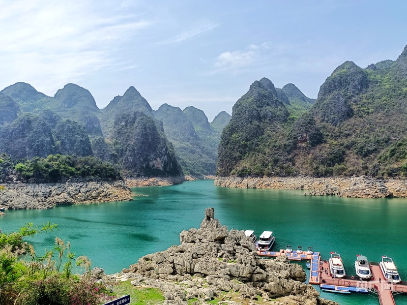 万峰湖上,游船划破翡翠般的湖面,游人惬意地倚在船舷边欣赏“湖在万峰中,峰在碧波上”的山水交融胜景。“万峰湖蓄水量达102亿立方米,湖面面积为176平方公里,是‘西电东送’的重要能源基地,也是‘珠三角’经济区的重要水源供给地,它起到了‘压咸补淡’的重要作用。”工作人员介绍道。
