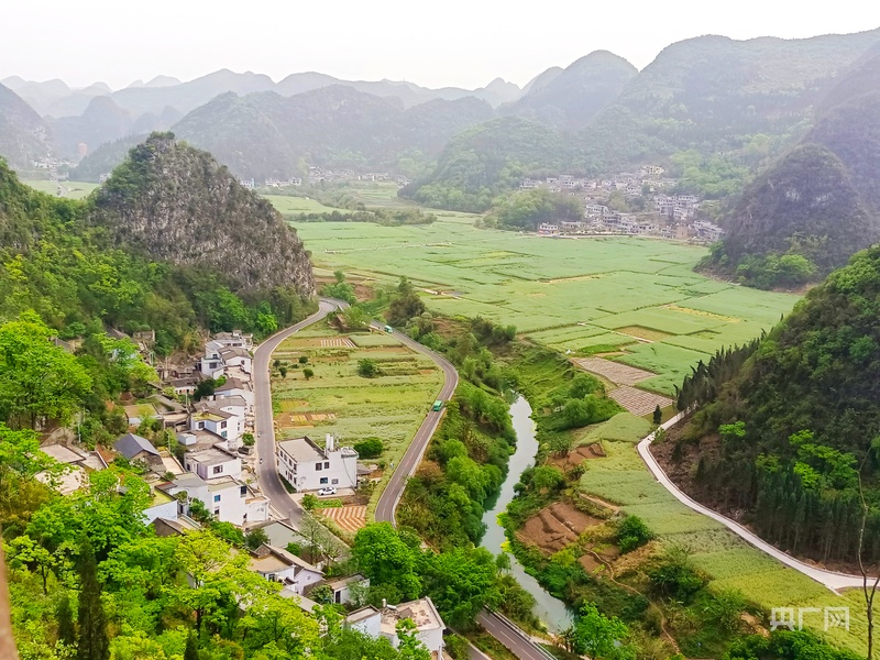 研学首站,采风团来到了“中国锥状喀斯特典范”万峰林。在半山观景台眺望远方,2万余座青翠峰丛层层叠叠、此起彼伏,宛如一片绿色的海洋;向下俯瞰,村落房舍依山傍水,在峰林的映衬下,构成一幅诗情画意的田园风光。