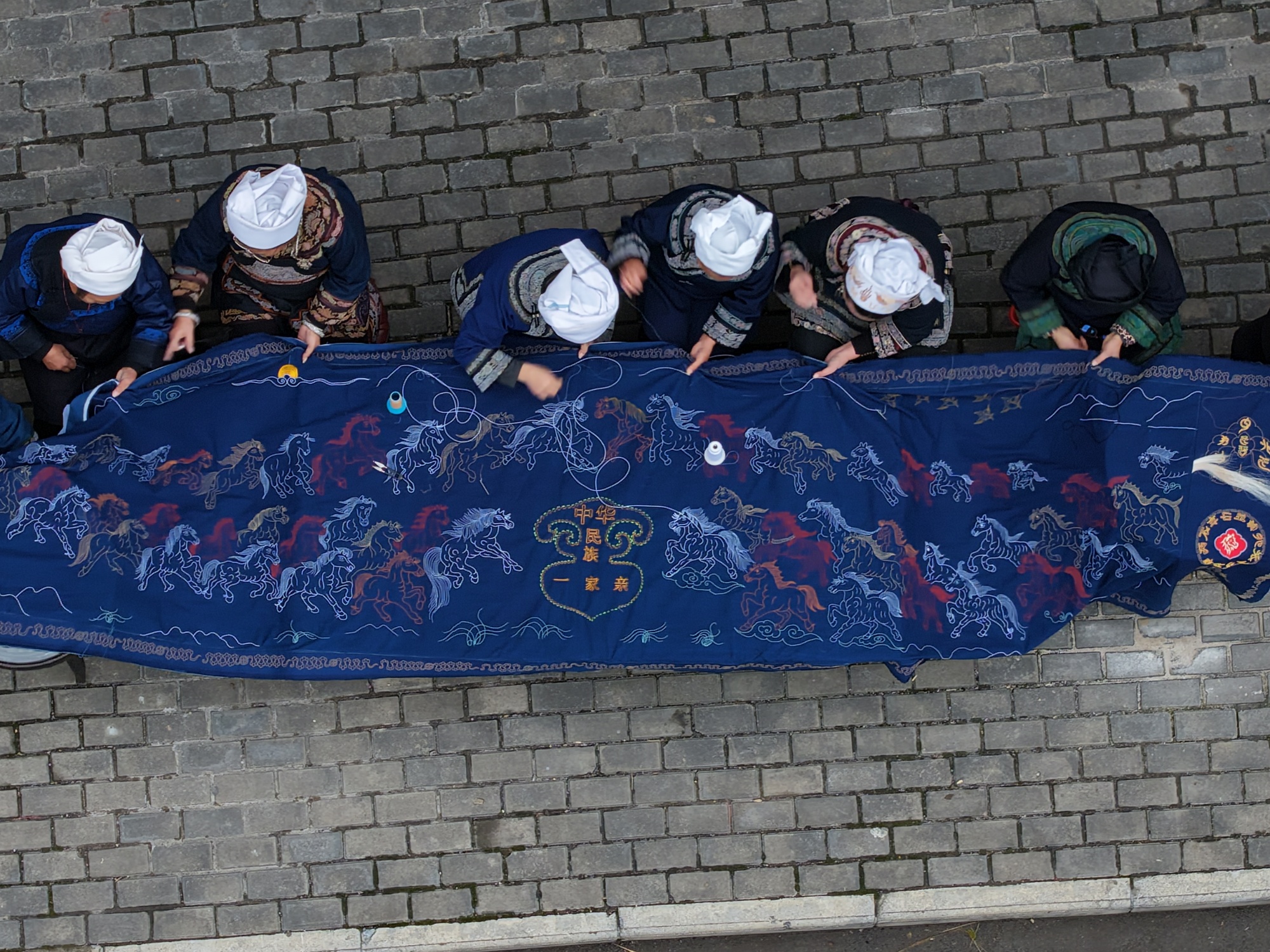 在三都自治县中和镇雪花湖社区非遗一条街,当地绣娘们齐聚一起,共同完成一份特殊的“新年礼物”——一幅长约五米的《奔腾骏马图》马尾绣长卷。