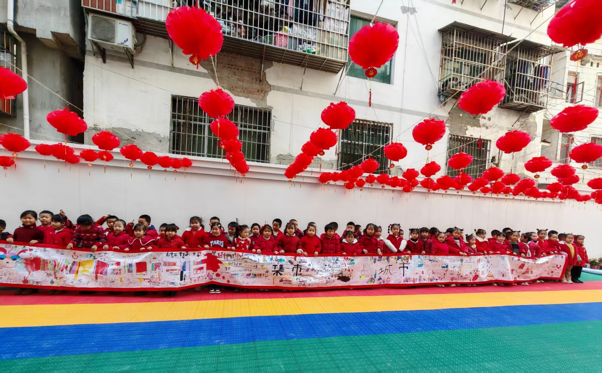 1月15日,贵州省黔东南州台江县城关第一幼儿园里一片红火热闹。操场上挂满了灯笼,飘着喜庆的气球,浓浓的年味儿扑面而来。全体老师和孩子都穿上了喜庆的红色衣裳,用一场快乐又温馨的“新春长卷绘未来”散学礼,为这个学期收尾,也一起迎接即将到来的马年。