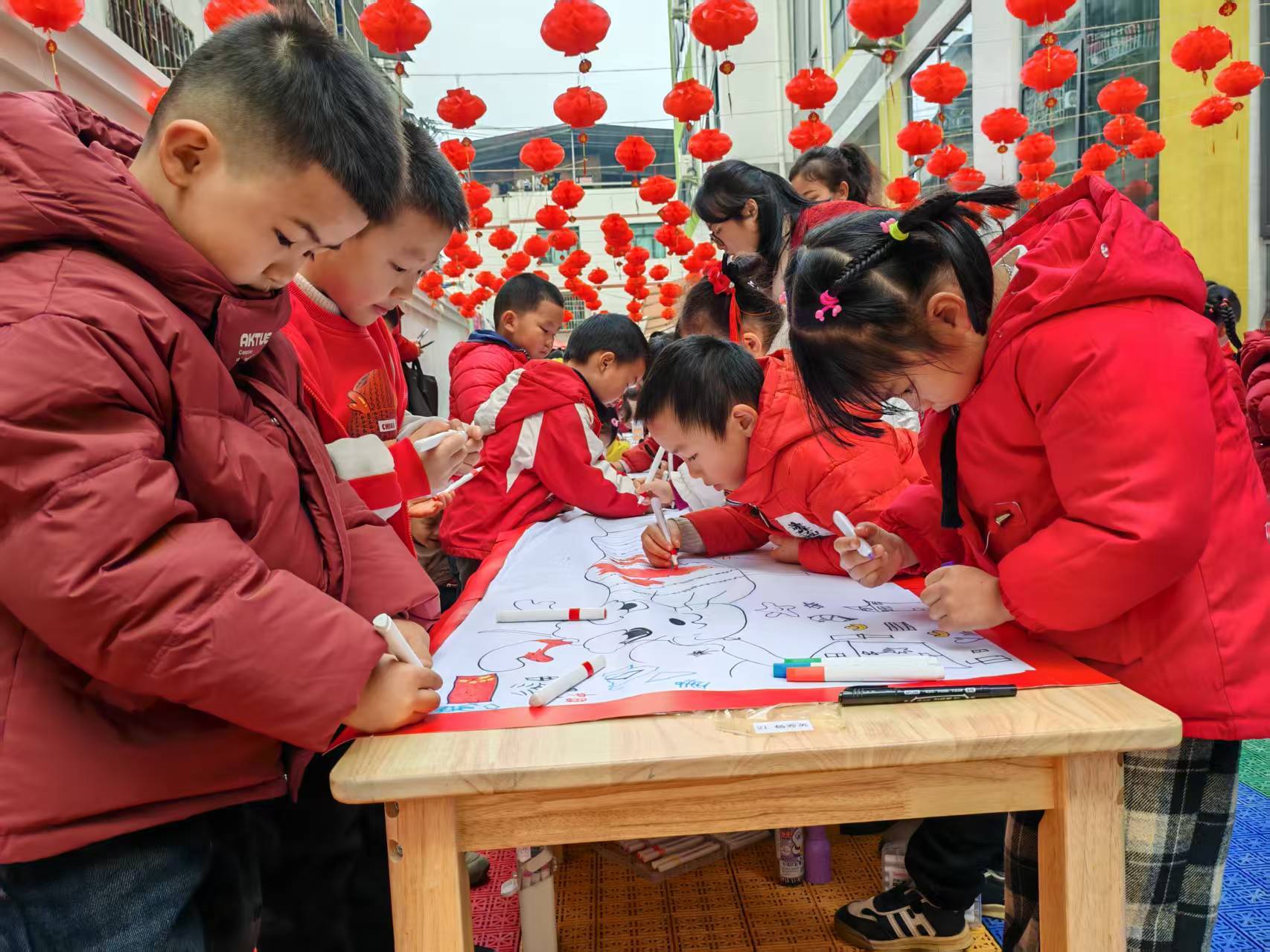 孩子们正在描绘新春长卷(台江县融媒体中心供图)