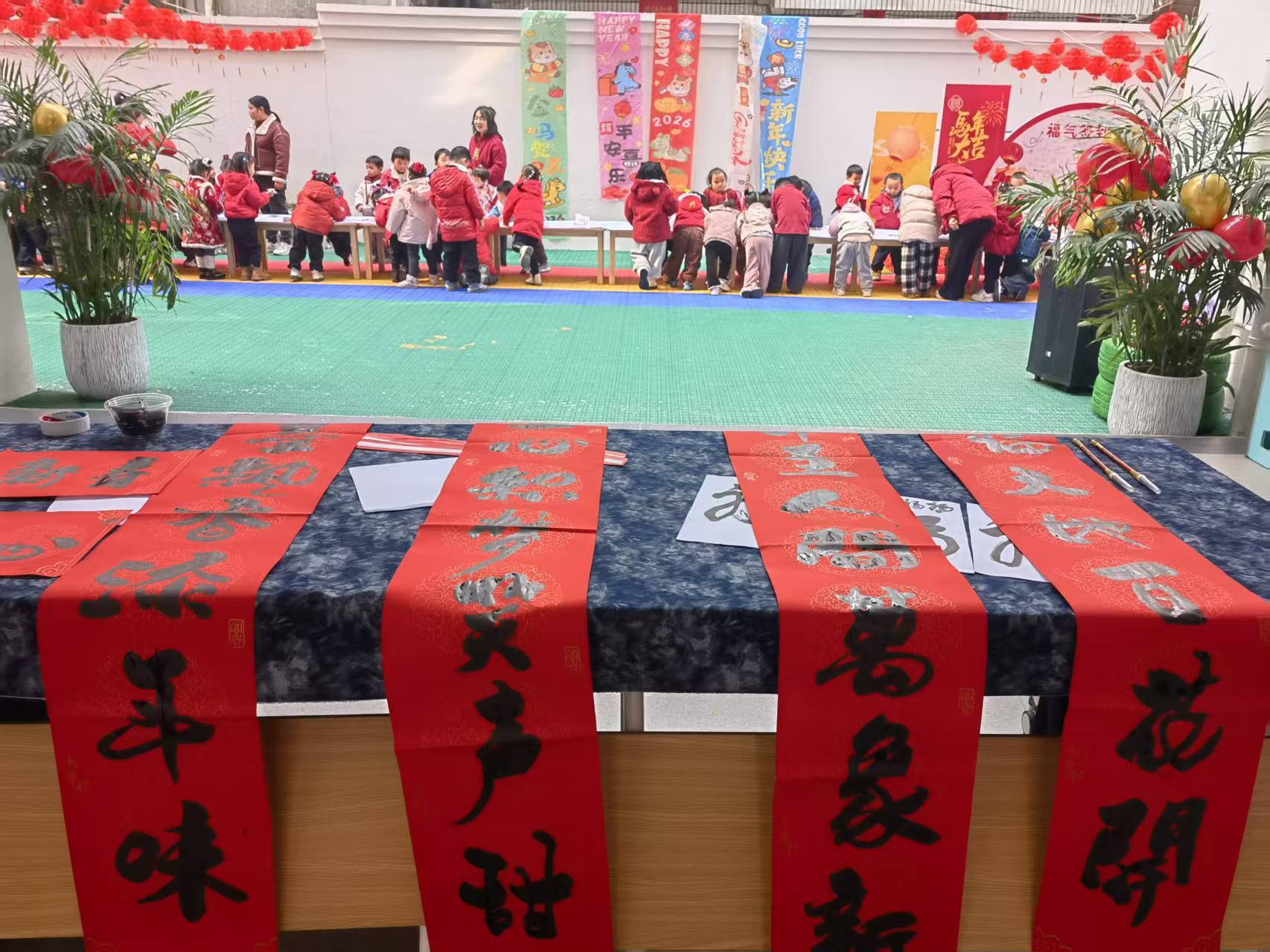 今年的活动还多了一份特别的“福气”。幼儿园请来了热爱书法的欧阳海先生,他展纸挥毫,墨香悄然弥漫。“春临大地百花艳,节至人间万象新”“翰墨飘香添年味,童心织梦笑语甜”……一副副春联在他笔下流淌而出,围观的老师和孩子们忍不住发出轻轻的赞叹。园里还收到了其他书法爱好者送来的墨宝,为幼儿园添上了满满的文化气息。